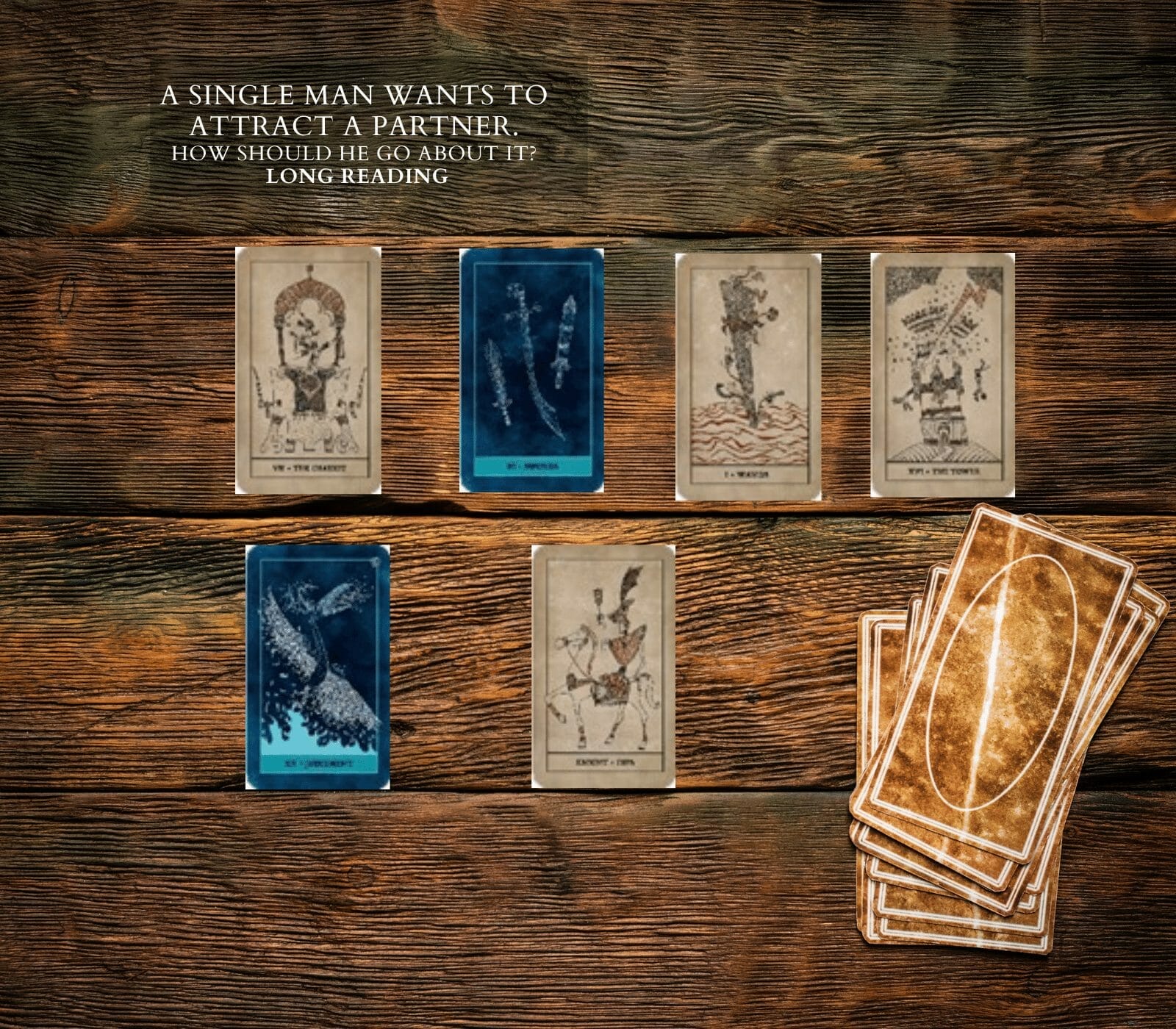 He draws Strength (S) and the Knight of Serpents (L). Here the Knight faces Strength, who looks away. He should let down his reserves and be prepared to be both charming and charmed. He might start looking at a music venue.